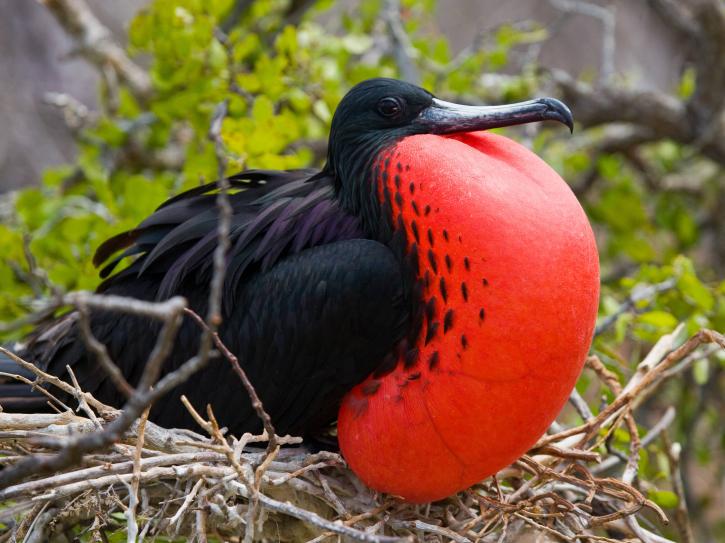 - Фрегаты — птицы с внушительным размахом крыльев и ярко‑красным горловым мешком у самцов, напоминающим парус. Во время брачного периода они раздувают мешок и становятся похожими на шарики.