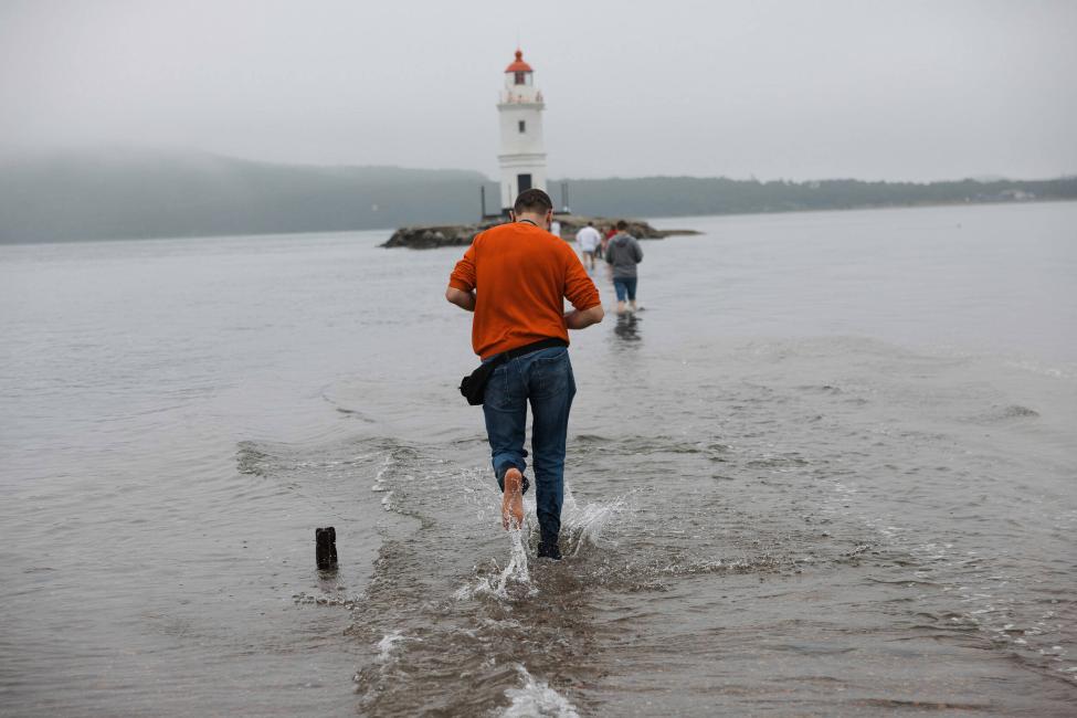 С утра мы оперативно мониторили ситуацию на дорогах, и в случае ремонта или пробок тайминг и очередность локаций могли меняться. Но мы двигались по плану и достигли первой остановки — маяка Токарёвского. Здесь, на символическом «краю земли», можно увидеть точку, где «начинается Тихий океан». Радость и восторг захлестнули группу. Недолго думая, участники скинули обувь и босиком пошли по каменистой косе к маяку. Кажется, только так и нужно здороваться с морем.