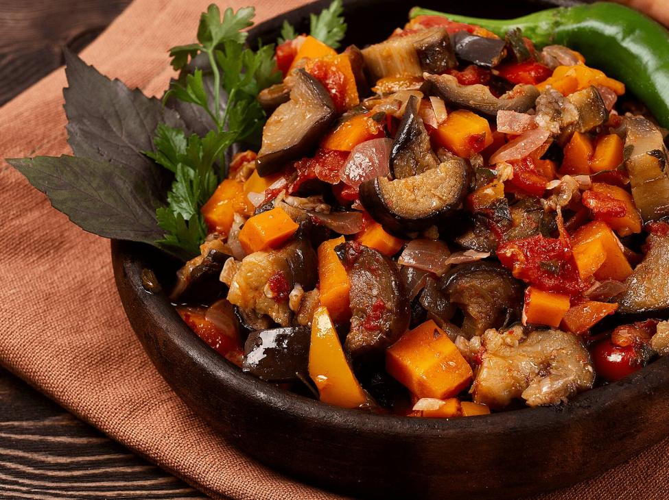 В Грузии рассказывают, что аджапсандал придумали сотни лет назад местные пастухи. Они на костре обжаривали паприку и баклажаны, давили их, смешивали с травами и специями — и получалось что‑то вроде овощной пасты или соуса. Блюдо помогало пастухам утолять голод во время работы на пастбищах.