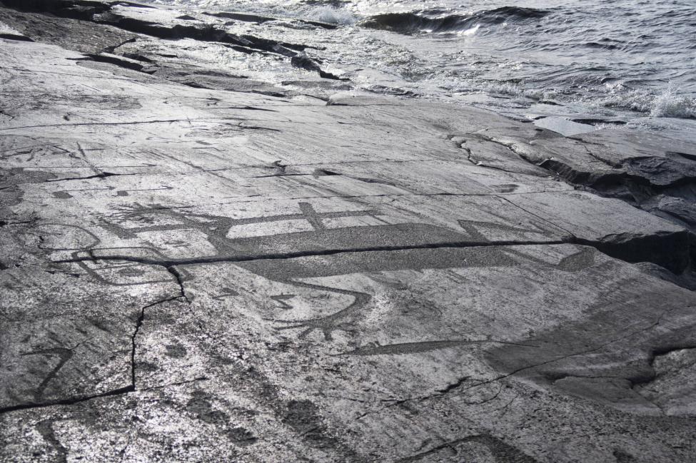 На этом острове выбиты сцены охоты на лосей и морского промысла, а еще «карельская Камасутра» — с участием четырех пар. Одна из выбивок напоминает человека‑белуху — возможно, это морское божество.