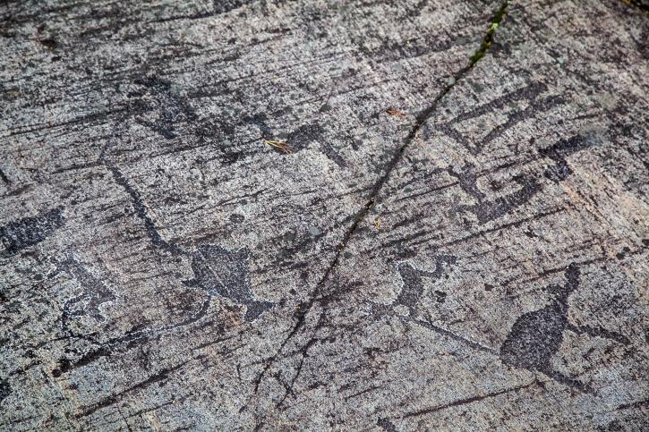 На этом острове выбиты сцены охоты на лосей и морского промысла, а еще «карельская Камасутра» — с участием четырех пар. Одна из выбивок напоминает человека‑белуху — возможно, это морское божество.