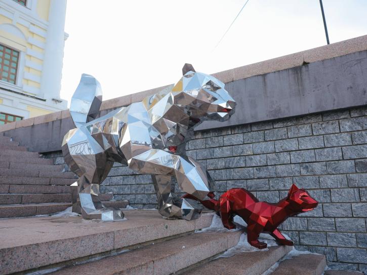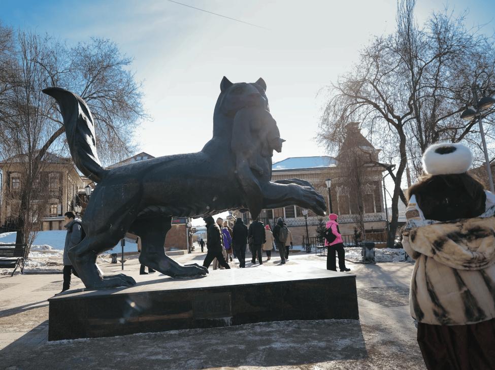 После музея мы посетили еще одно знаковое место Иркутска — 130-й квартал. Здесь расположены памятники архитектуры, музеи, мастерские, стилизованные под исторические здания купеческого города. А при входе нас встретил знаменитый памятник бабру, который держит в зубах соболя. Гости сфотографировались с бронзовым хищником и прогулялись среди исторических построек.