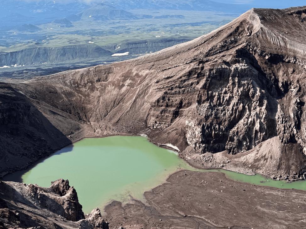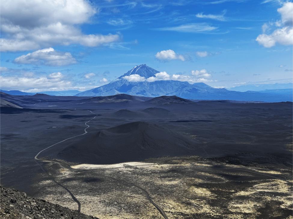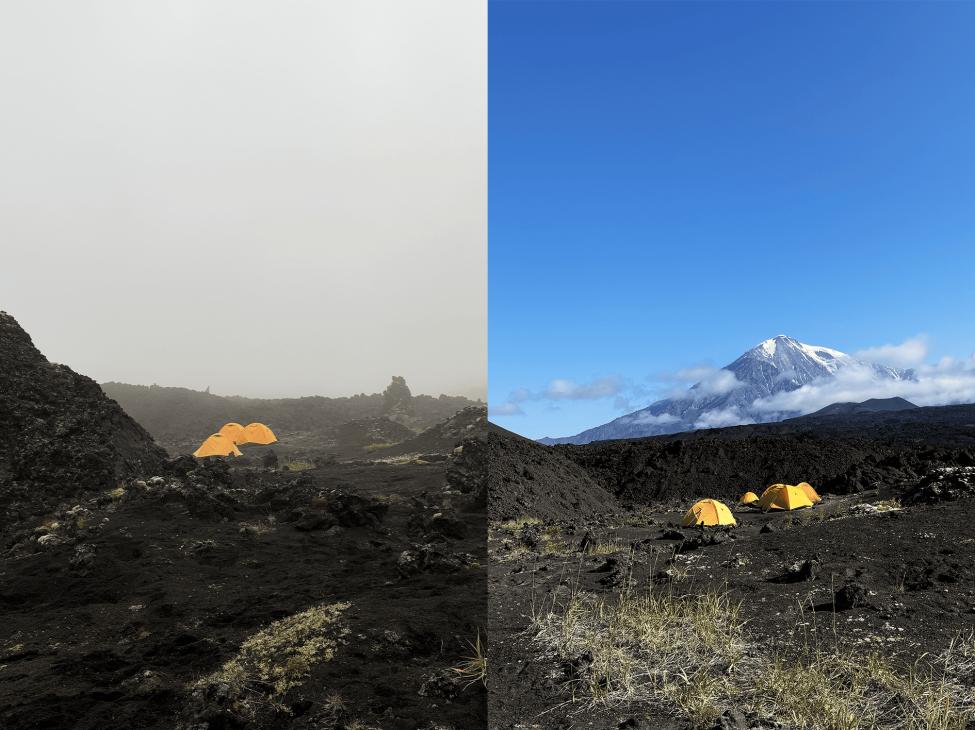 К счастью, пока мы гуляли по конусу, туман начал постепенно рассеиваться, и нам удалось полюбоваться видами не только на фото. Сперва нам показалась вершина Острого Толбачика, а затем, когда мы возвращались в лагерь, открылся и Плоский.