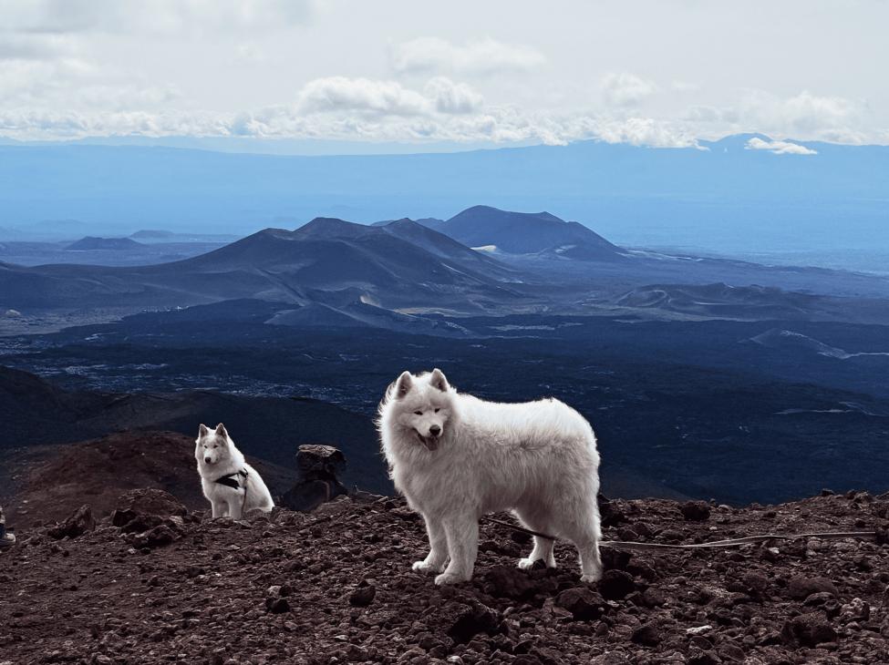 Обычно с конуса открывается великолепная панорама на Толбачик. Но, поднявшись на вершину, мы обнаружили лишь плотный туман и пару белоснежных собак, греющихся возле фумарол. Именно тогда в группе появилось новое крылатое выражение, автором которого стал наш гид: «Здесь очень красиво, просто сейчас ничего не видно, я вам потом фотки в телефоне покажу».