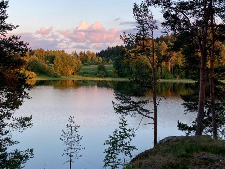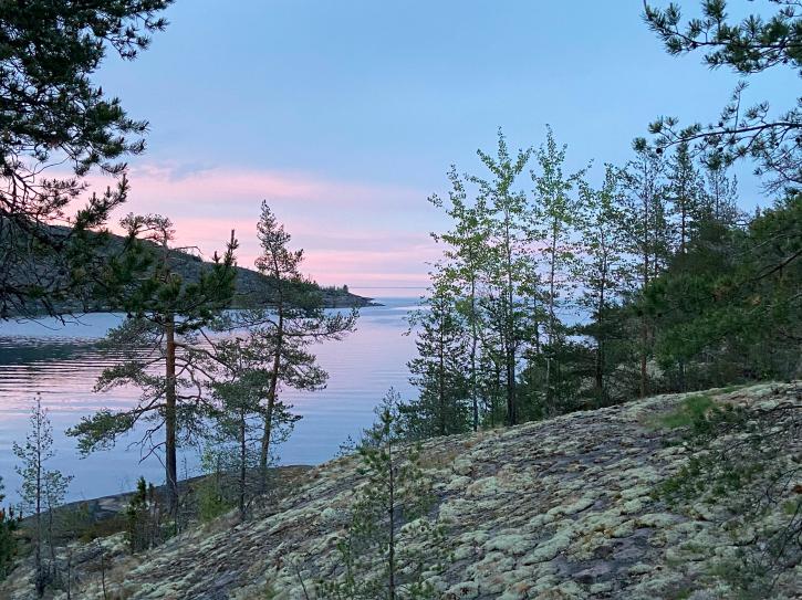 С моей соседкой Настей заканчиваем ставить палатку и предпринимаем последнюю попытку вбить колышки. Под ногами мягкий северный мох, на котором будет сладко спаться, но дальше, на глубине, — камни. Такие вот Ладожские шхеры со своими скалистыми островами. Колышки не вбиваются, и мы решаем растянуть ветровые веревки к соседним соснам — всё-таки стоим на берегу Ладоги. Хотя ветра по‑прежнему нет.