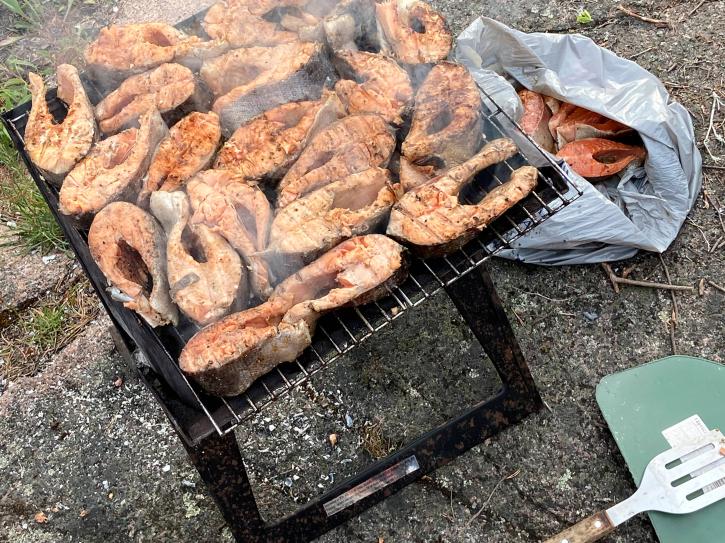 Ребята у костра уже приготовили ужин: форель и овощи на гриле, зеленый салат со специями, киноа. Шучу про «неоправданные» ожидания и гречу — и узнаю от нашего проводника, что меню для путешествия специально составлял шеф‑повар.