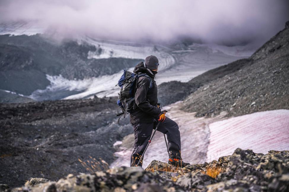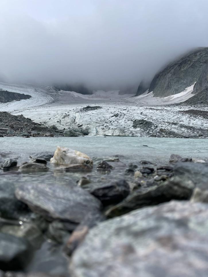 Восхождение к этому леднику было не таким сложным, как на Пендирмапэ, но восхождение есть восхождение — с курумником и набором высоты. Чем ближе мы подходили к леднику, тем сильнее становился ветер. У самого ледника я пыталась снять видео, и ветер чуть не вырвал телефон у меня из рук. Видео на удивление получилось почти ровным, спасибо технологиям за стабилизацию.