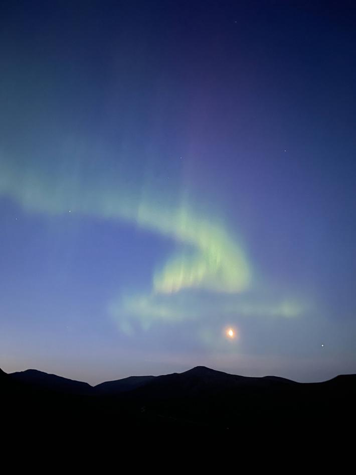 А вечером, когда мы вернулись после разминочного легкого треккинга к водопаду, после ужина, нас ждало первое за эту поездку северное сияние. Оно тоже было словно разминочным, не таким ярким, как те, что еще подарит нам Ямал, но всё-таки вполне заметным на бесконечно прекрасном звездном небе.