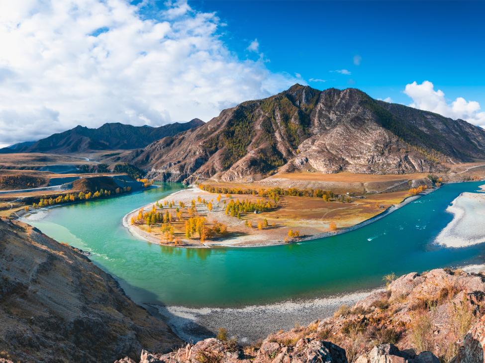 У Чуи и Катуни разный цвет воды, из-за чего место слияния рек выглядит необычно