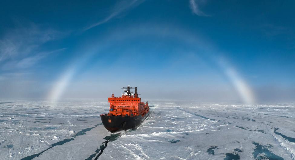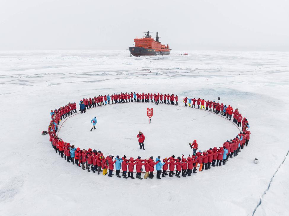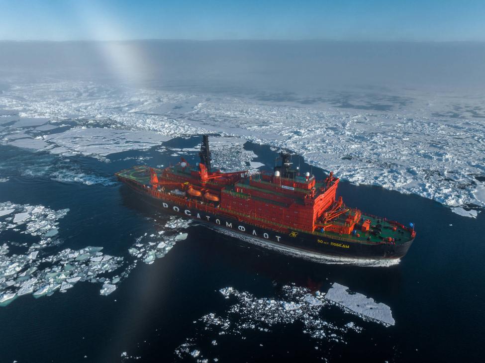 Путешественников из Мурманска на Северный полюс везет атомный ледокол «50 лет Победы». Ему принадлежит круглое достижение — в 2013 году «50 лет Победы», впервые достигнув полюса, стал сотым надводным судном, которое добралось до самой северной точки планеты.