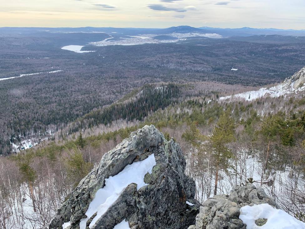 Перед закатом я прогулялась на вершину Бараньи лбы. Оттуда было видно километры леса, хребет с вершинами Митькины скалы и Откликной гребень, Круглицу, Ицыл. А еще Большую Каменную реку и Златоуст — эта панорама стала моей любимой за всю поездку.
