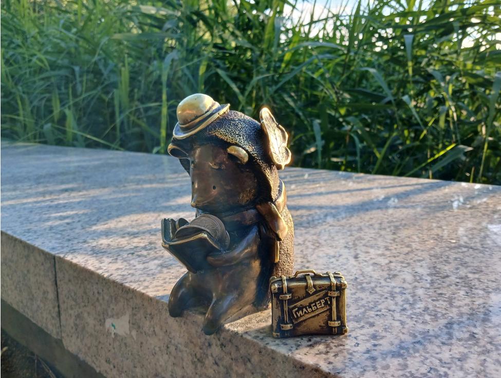 Светлоёжик Пыхтик читает книгу на берегу озера Тихого в Светлогорске
