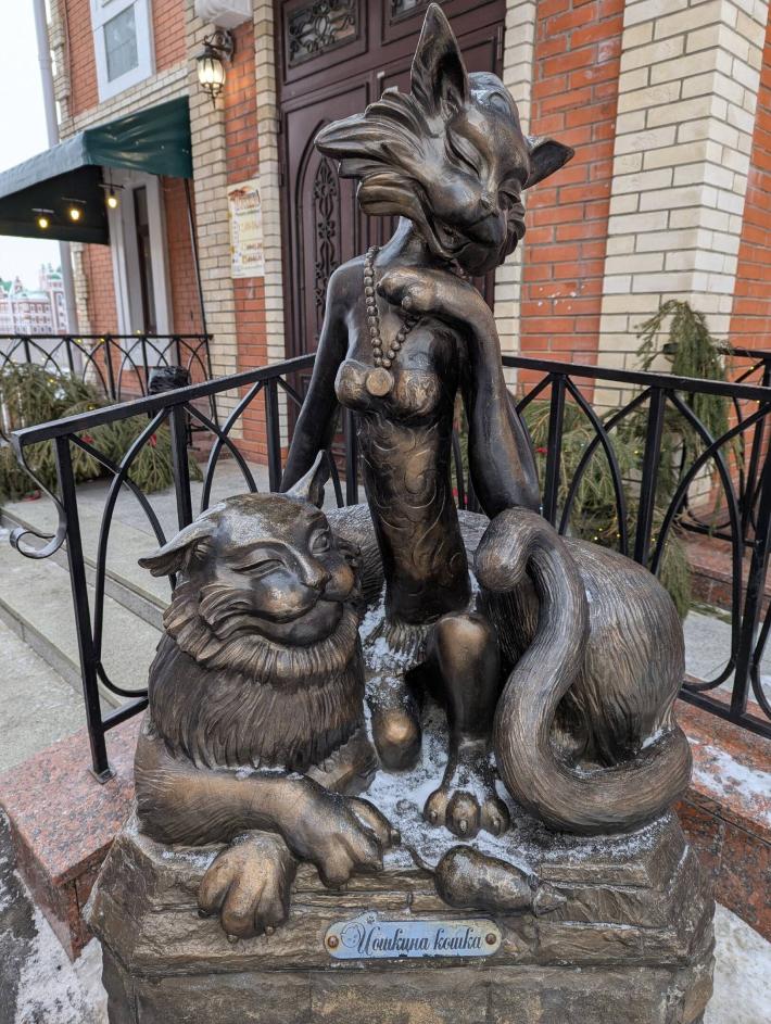 А несколько дальше, у кафе по адресу: Архангельская Слобода, 7, расположилась Йошкина кошка — игривая красавица в платье и с украшением на шее. Рядом с ней лежит кот, который придерживает кончиком лапы убегающую мышь.