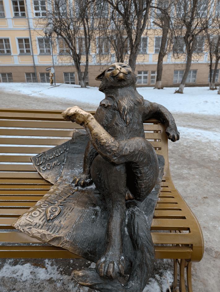 Глава котосемейства Йошкин кот весом 150 килограммов вальяжно присел на скамейку перед зданием Марийского университета. Он выглядит довольным и позволяет присесть рядом с ним. Очень по‑кошачьи!