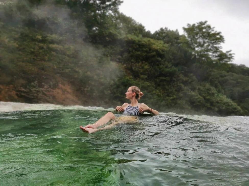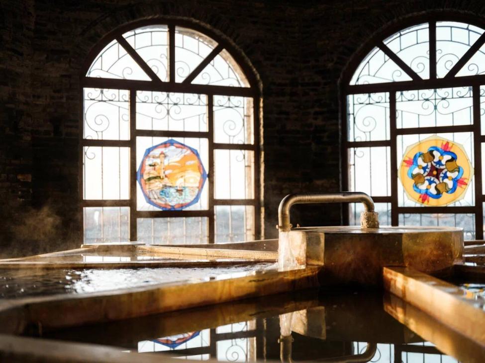 Вода: гидрокарбонатная‑сульфатно-натриевая с содержанием кремния и радона. Температура в теплом бассейне — 30 ⁰С, в горячем — 41 ⁰С.