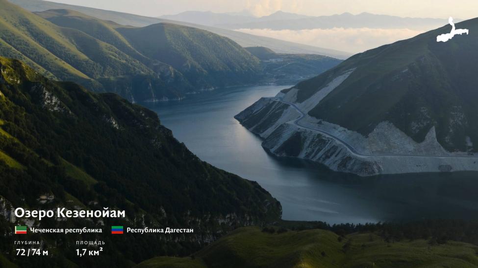 Озеро Кезенойам — самое большое на Северном Кавказе и одно из самых красивых. Оно расположено на границе Чеченской Республики и Дагестана, среди живописных горных склонов. Место точно понравится тем, кто любит фотографировать: у озера необычный цвет, который в зависимости от погоды меняется от небесно‑голубого до насыщенного синего и бирюзового. Горы укрывают озеро от ветров, поэтому на нём не бывает волн и выглядит оно как зеркало.