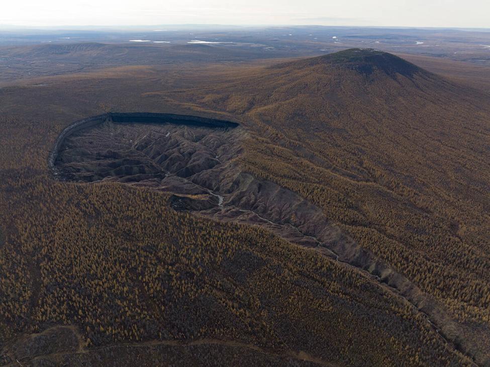 Батагайский кратер, также известный как «Сибирские врата в ад», является крупнейшей в мире термокарстовой впадиной в вечной мерзлоте. Длиной впадина почти километр, ширина ее 800 метров при глубине под сотню.