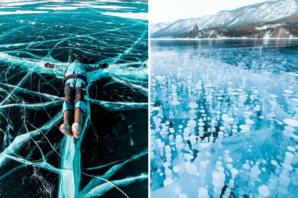 Одно из самых красивых и необычных явлений на Байкале зимой — лед с пузырьками. В чистом и прозрачном льду хорошо видны струйки пузырьков разного диаметра: они поднимаются из глубины озера и создают объемные картины. Это пары метана, которые застывают в толще льда. Байкальские пузырьки — самый популярный мотив для фото.