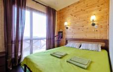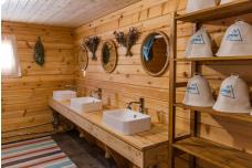 Вы разместитесь в отапливаемых домиках 20 м² с двуспальной кроватью king size или двумя односпальными кроватями. Рядом установлены личный биотуалет и умывальник с холодной водой.