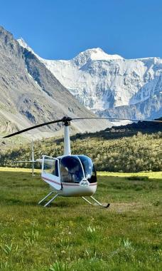 Пролетите на вертолете над горой Белуха — высшей точкой Алтайских гор. На ее вершинах даже летом сохраняются ледники и снега