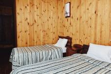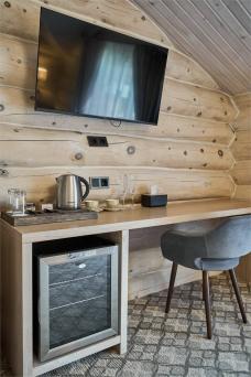 Вы разместитесь в гостевых домах из бруса с панорамными окнами и большой террасой. В одной комнате большая двуспальная кровать, в другой — камин и раcкладной двухместный диван. Комнаты не разделены дверьми. В домиках: ванная комната, обогреватель, подогреваемый пол, фен.