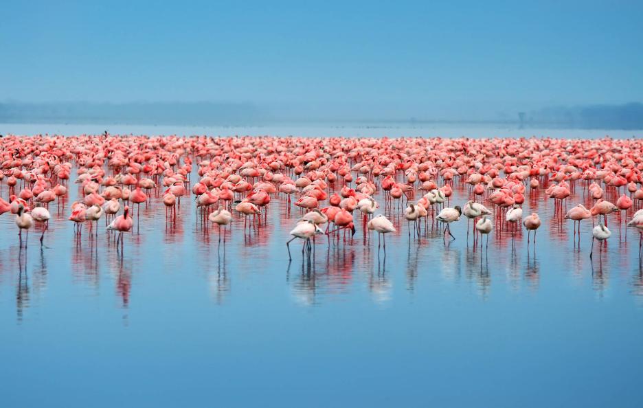 Станем свидетелями захватывающего зрелища — как огромные стаи розовых фламинго кормятся на мелководье озера Накуру