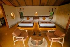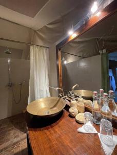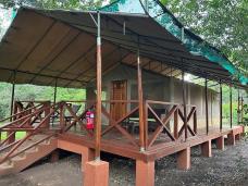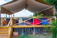 Вы разместитесь в домике-тенте с 1 двуспальной или 2 односпальными кроватями, собственным санузлом с душем и верандой.