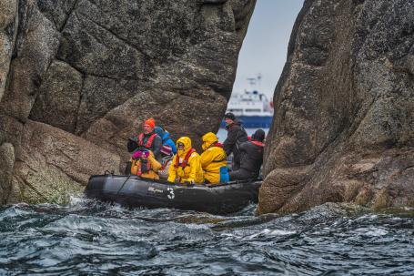 Обувь: трекинговые ботинки. Если вы предпочтете трекинговые ботинки резиновым сапогам, вам следует взять их с собой в рюкзаке и переодеть уже на берегу. Ботинки с рифленой подошвой позволят вам стоять наиболее устойчиво. Резиновые сапоги также необходимы — их предоставят на борту бесплатно. Важно взять с собой теплые стельки. Если планируете взять собственные сапоги, они должны быть высотой до середины икры или выше с толстой ребристой нескользящей подошвой. При некоторых высадках придется наступать в воду глубиной до 25 см. Также на льду и на берегу может быть довольно скользко. Убедитесь, что сапоги удобно сидят на шерстяном носке. Также понадобятся сандалии, кеды или любая другая удобная обувь для корабля, а также шлепанцы для душа.