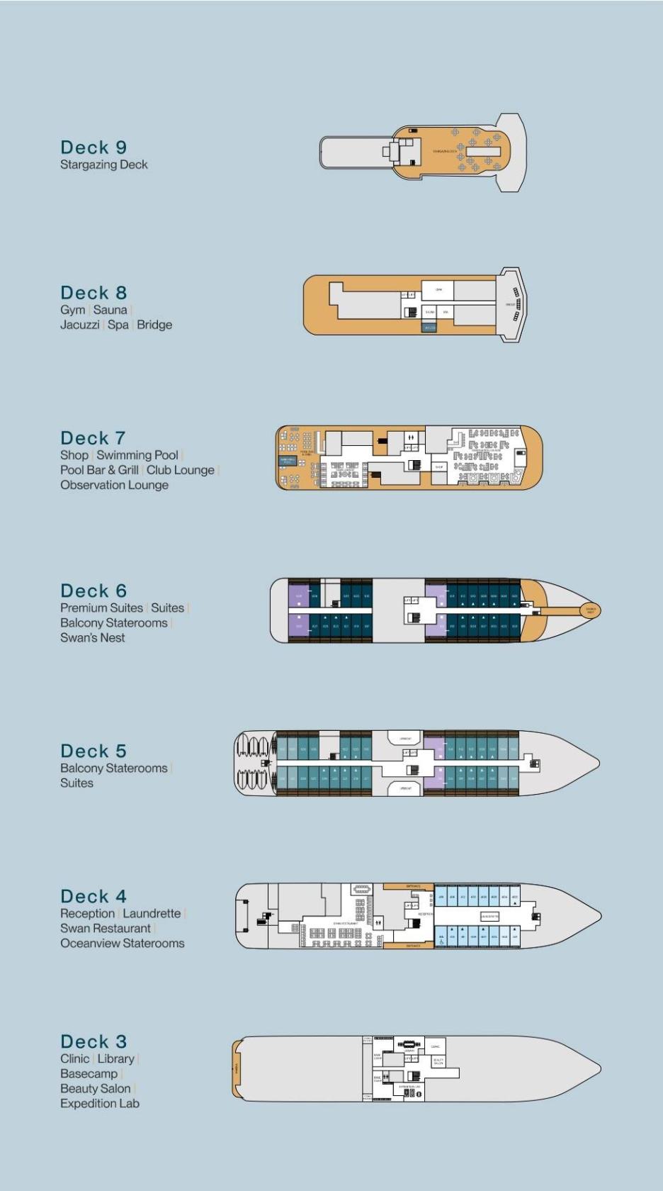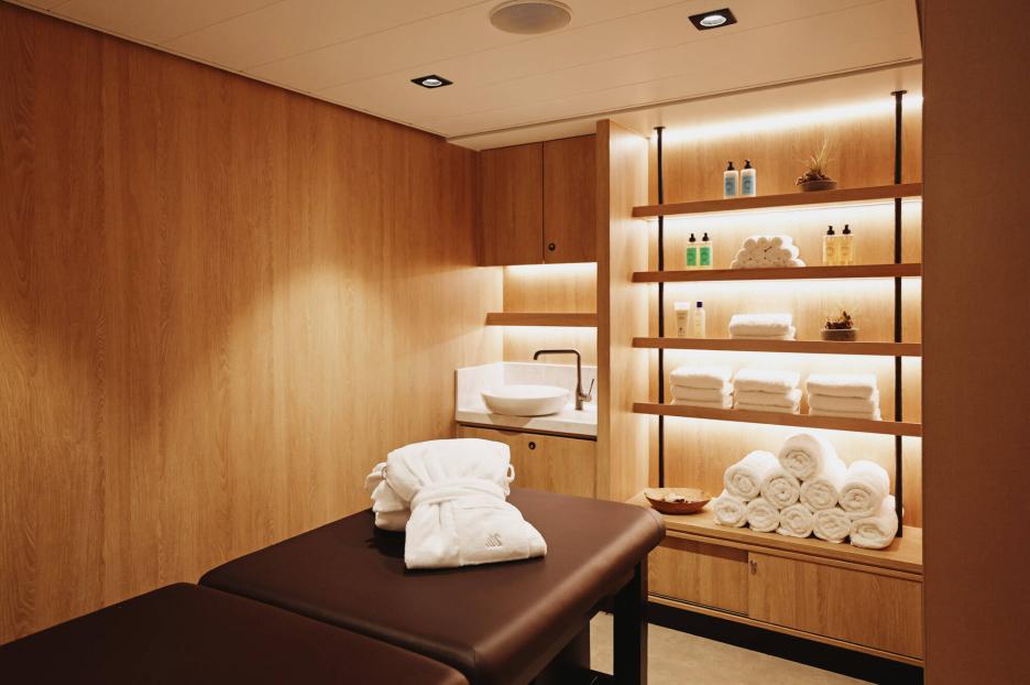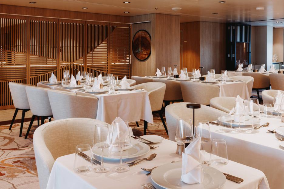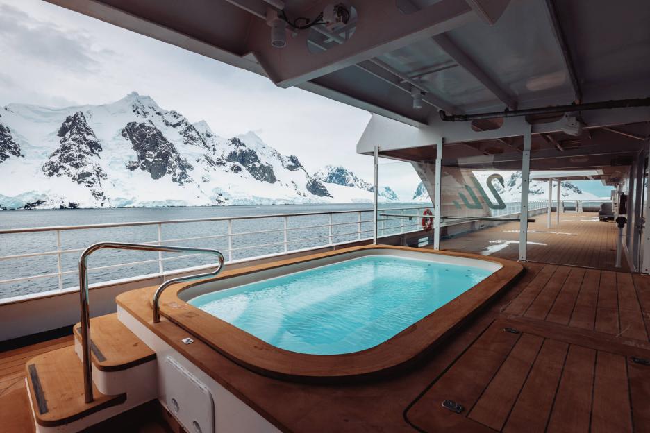 На борту: рестораны высокой кухни и гриль-бар под открытым небом, клубный лаунж с круглосуточным доступом к напиткам и закускам, бассейн-инфинити с видом на море, сауна, фитнес-зал, джакузи, библиотека, прачечная и уютный лекторий. Для высадок предусмотрен просторный Basecamp — удобная зона, где можно переодеться в экспедиционную экипировку.