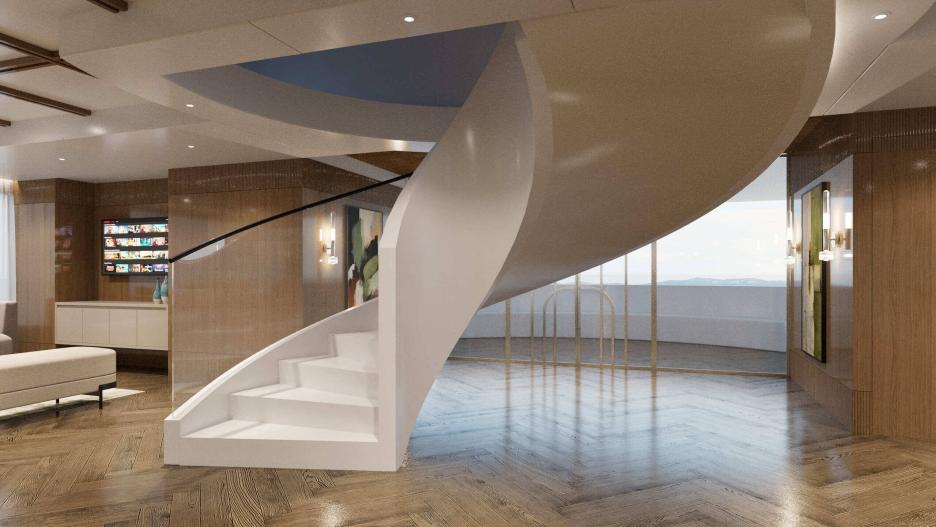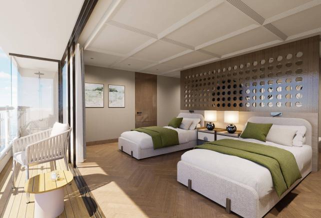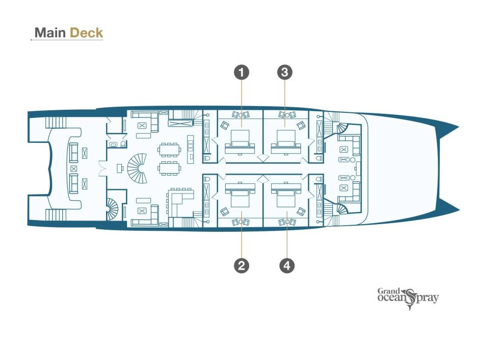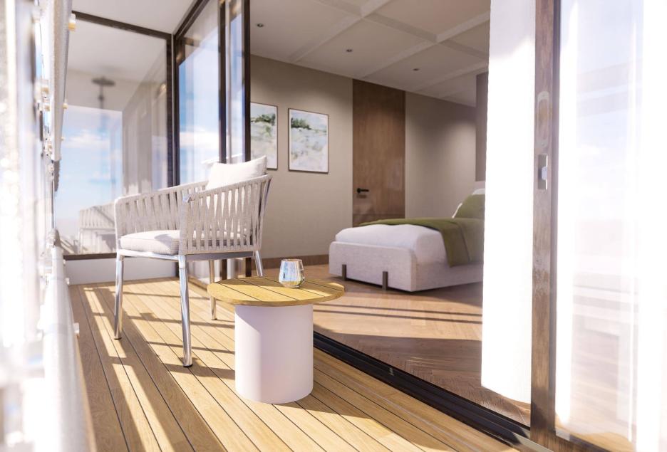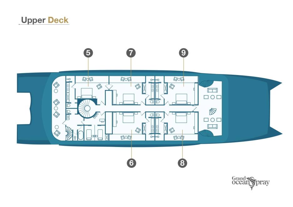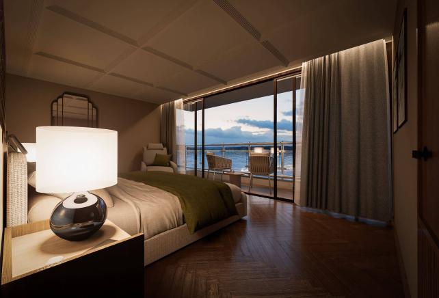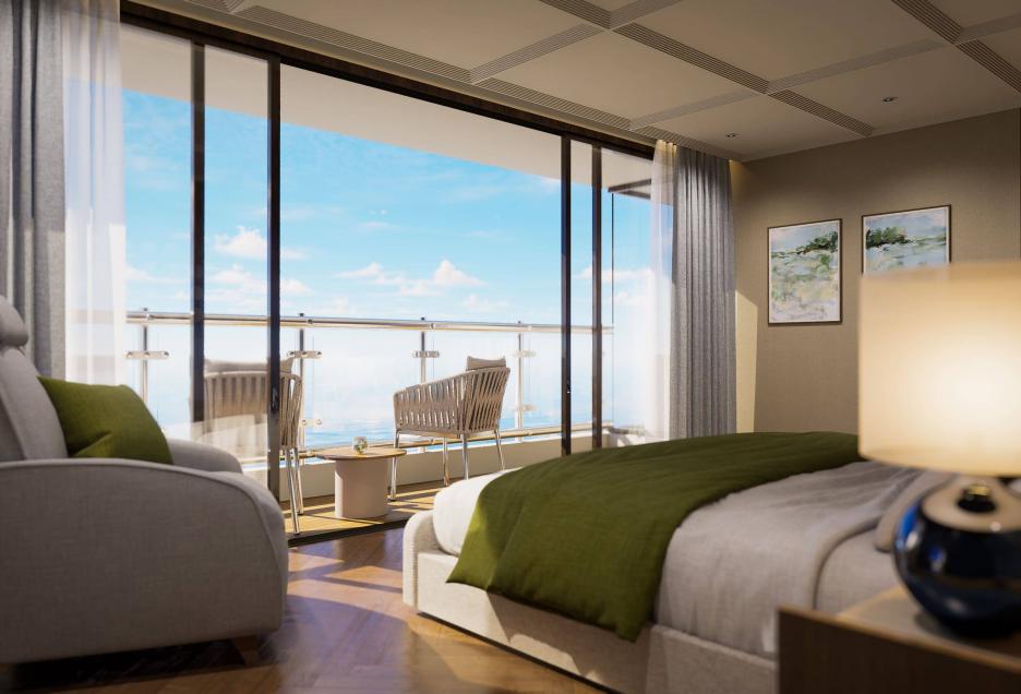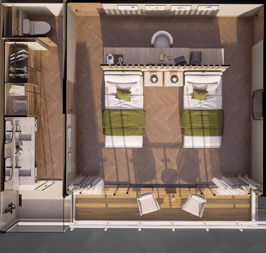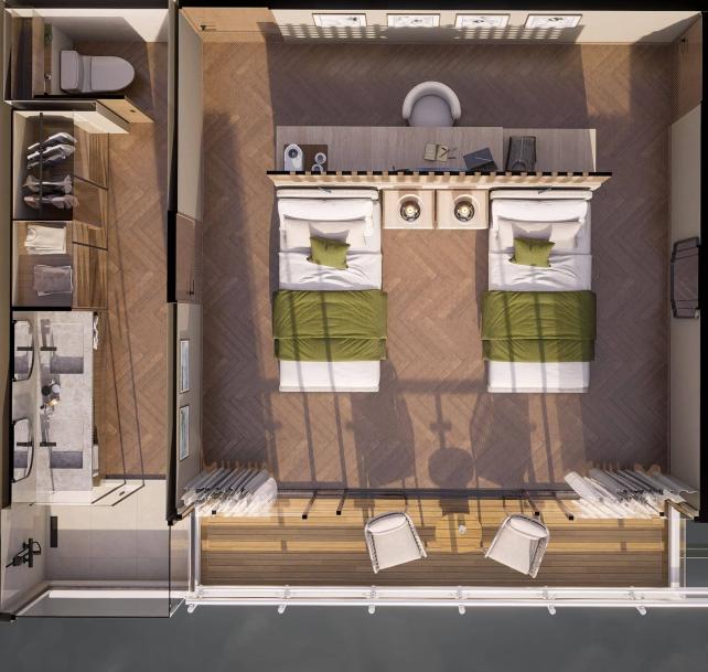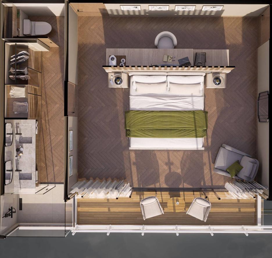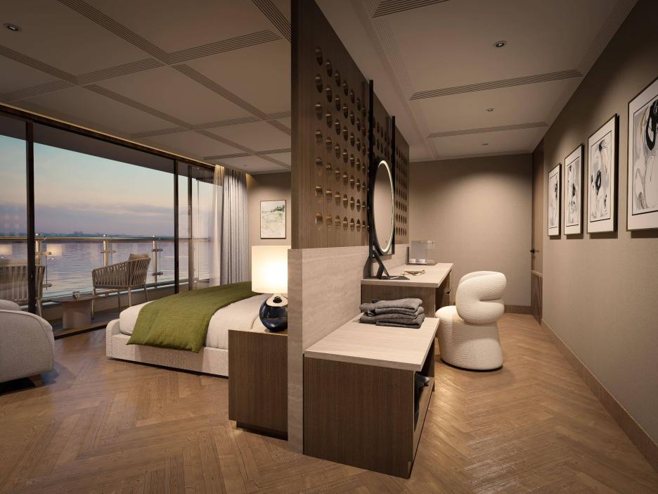 На борту расположены 8 люксов (42 м²) с панорамными дверями и собственными балконами. В каждой каюте: система климат-контроля, одна кровать king-size или две кровати twin, ванная комната, вместительный шкаф и туалетный столик.