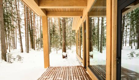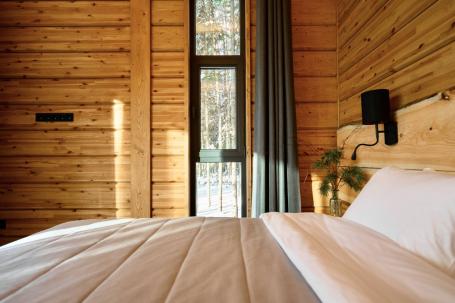Вы будете жить в двухместных экокоттеджах с панорамными окнами. Здесь только натуральное дерево, камень, минералы и текстиль. Все пропитки и жидкости — на основе органических масел.
