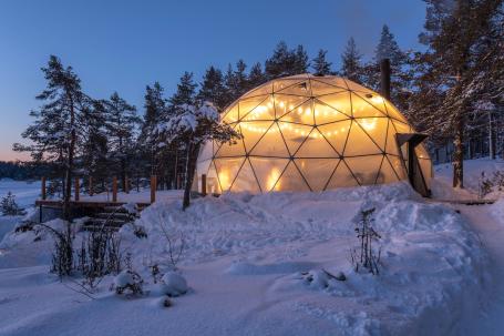 Ночь вы проведете в шатрах-полусферах в окружении соснового леса.