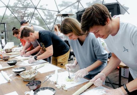 За ужином вы сможете попробовать настойки из местных ягод, бальзам, биттер и джин. Узнаете об ингредиентах напитков и их полезных свойствах. Ночь проведете в уютных шатрах-полусферах в окружении соснового леса.