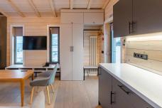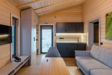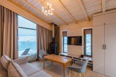 Вы разместитесь в одном из 13 коттеджей площадью 30 м² с панорамным остеклением и вместимостью до 4 гостей. В коттедже: кухня-гостиная с камином, спальня с двуспальной кроватью, раскладной диван, ванная комната с душевой кабиной, терраса с уличной мебелью. Работает Wi-Fi.