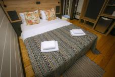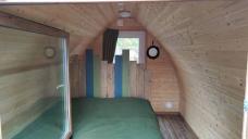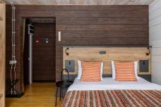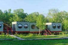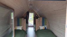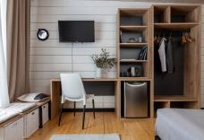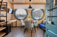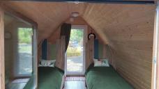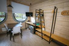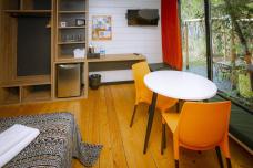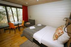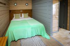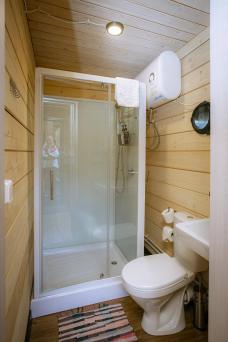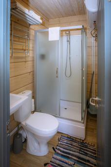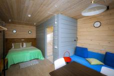 Вы разместитесь в стандартном модульном домике с 1 двуспальной или 2 односпальной кроватью, телевизором, мини-холодильником и собственным санузлом с душевой кабиной.