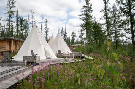 Вы отдохнете в современном лагере с городским комфортом, расположенном в Эвенкии на берегу реки Бахта — вблизи географического центра России. Вас ждут двухместные обустроенные чумы, баня с душем, комфортный санузел и специальные сушилки для экипировки. Вечерами вы будете ужинать в ресторане с аутентичным таежным меню или у барбекю-зоны. А в этническом музее лагеря познакомитесь с культурой коренных народов севера.