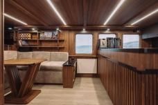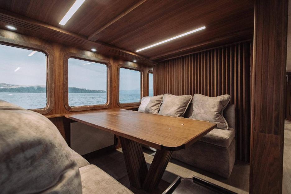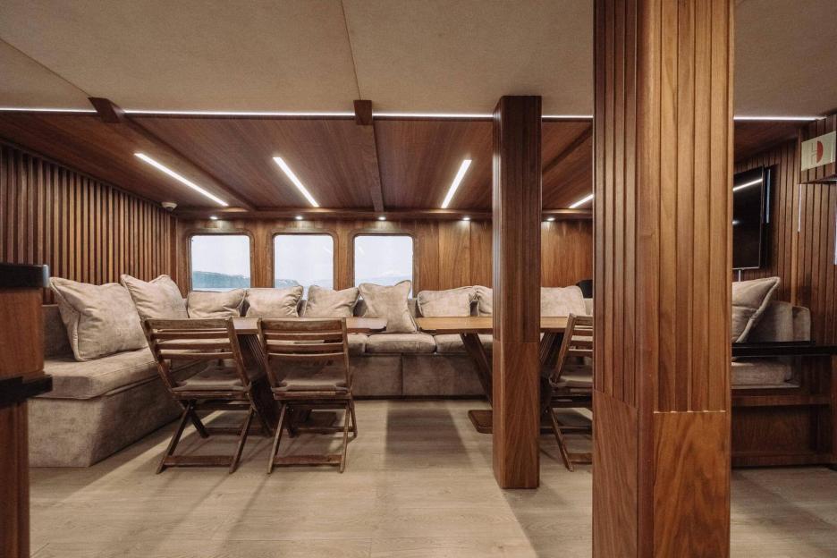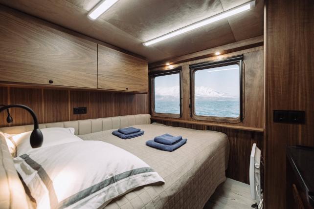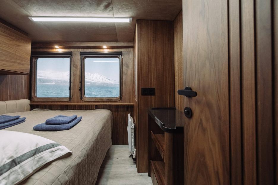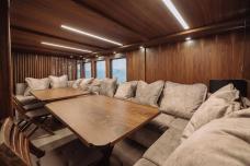 Судно прошло полную реновацию в 2025 году. Все помещения тепло- и звукоизолированы, снабжены вентиляцией и отоплением. На борту к вашим услугам будут финская сауна (работает во время стоянок), площадка для отдыха и фото- и видеосъемки, бар с мультимедиа-центром с караоке, TV-монитор и тематические книги.
