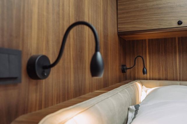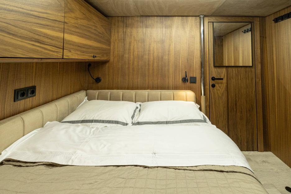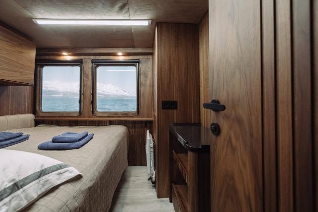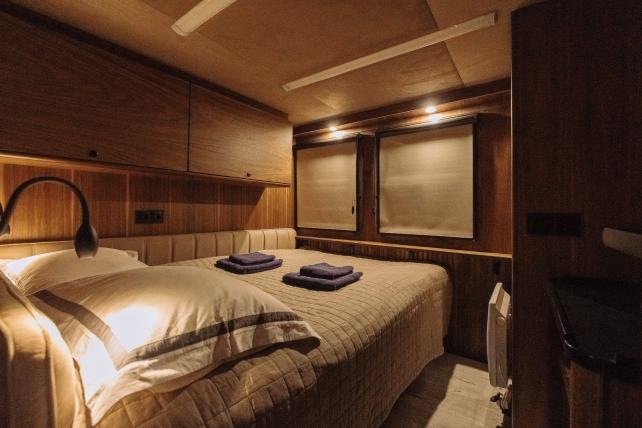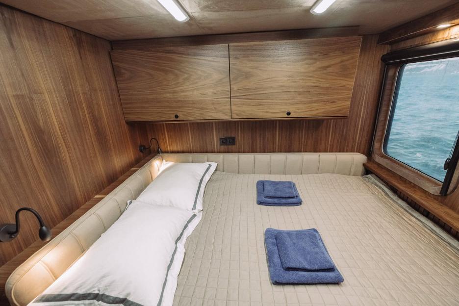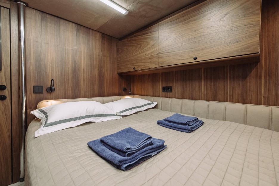 Вы разместитесь в 6 небольших уютных каютах: в двух из них расположены двуспальные кровати, в остальных четырех — две односпальные. В каждой каюте — окна, стол, шкафы и полки, вешалки и личный ночник. 3 душевых и 3 туалетных комнаты располагаются на той же палубе.
