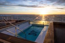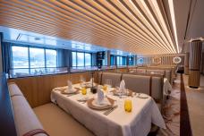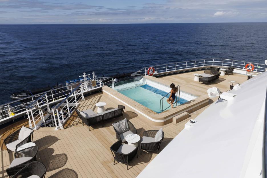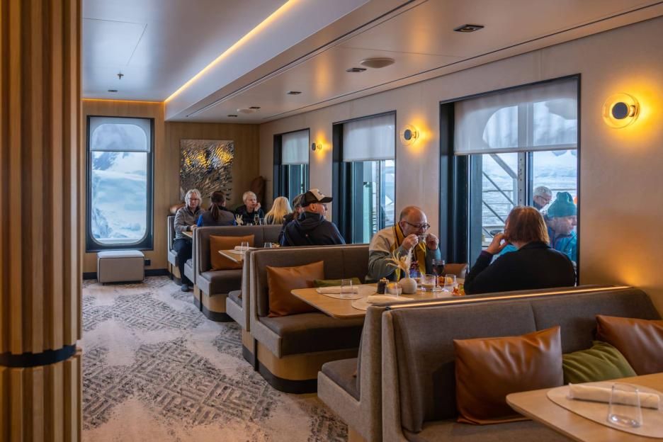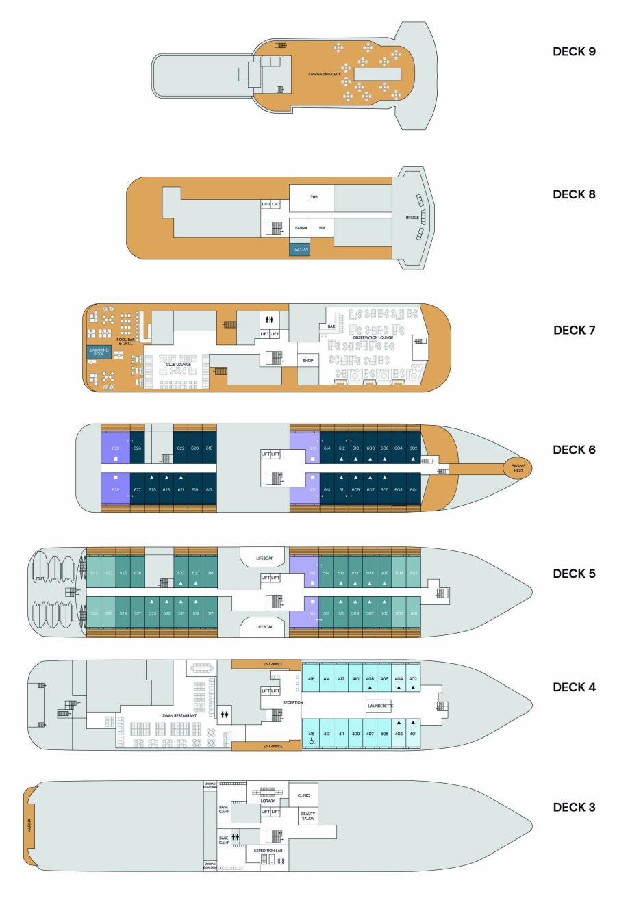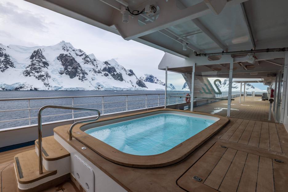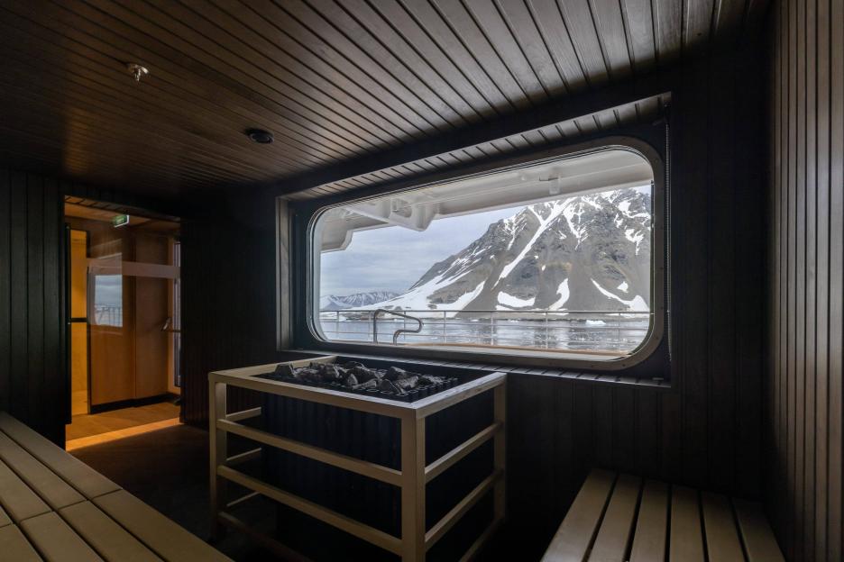 На борту: рестораны высокой кухни и гриль-бар под открытым небом, клубный лаунж с круглосуточным доступом к напиткам и закускам, бассейн-инфинити с видом на море, сауна, фитнес-зал, джакузи, библиотека, прачечная и уютный лекторий. Для высадок предусмотрен просторный Basecamp — удобная зона, где можно переодеться в экспедиционную экипировку.