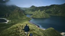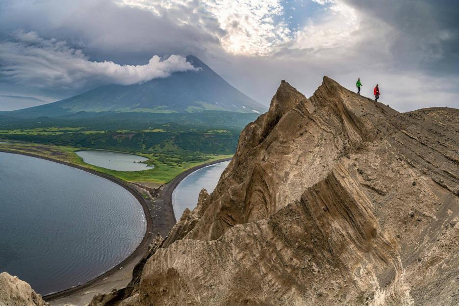 Пейзаж поражает своей масштабностью: внутри гигантской кальдеры древнего вулкана Тао-Русыр раскинулось Кольцевое озеро — а прямо в его центре поднимается идеальный конус вулкана.