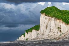 Перед вами откроется пейзаж ярких контрастов: у подножия Белых скал лежит темно-серый вулканический песок, а сверху их украшает изумрудная растительность.