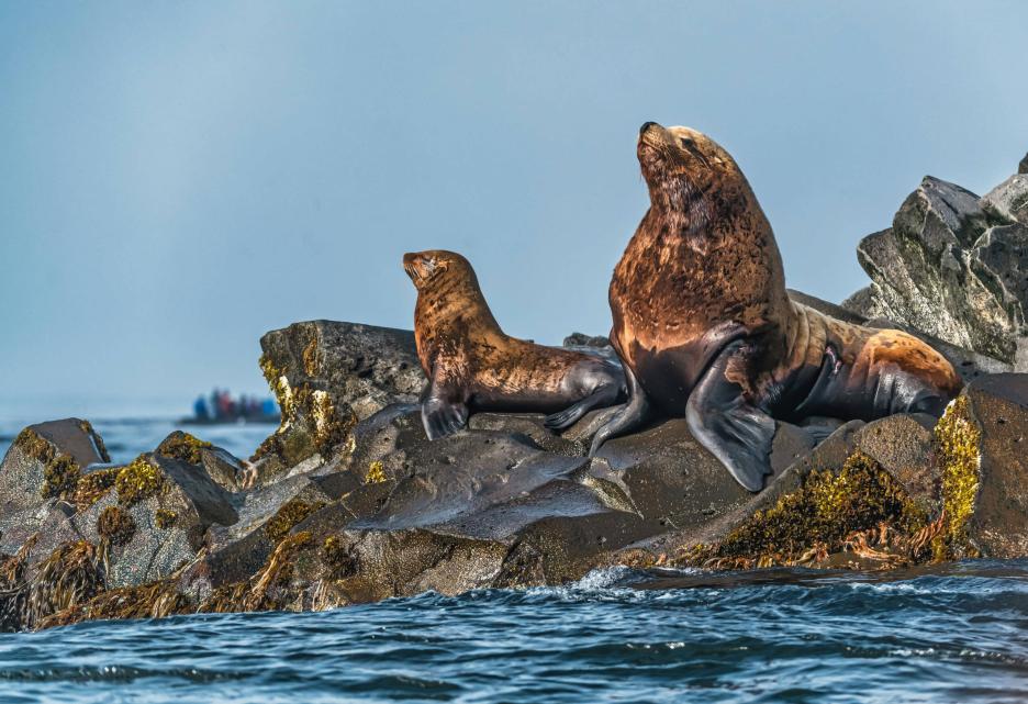 Ваша экспедиция начнется уже сегодня — с прогулки на лодках-зодиаках в бухте Русская. Вы близко подойдете к сивучам и, возможно, увидите одну из крупнейших птиц планеты — белоплечего орлана с размахом крыльев до 2,5 м. В период нереста на побережье встречаются бурые медведи, а у входа в бухту часто появляются косатки.