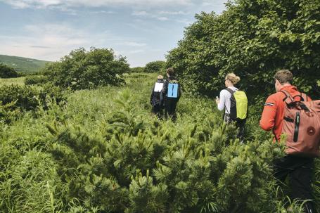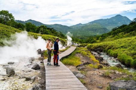 Помимо Тяти, на острове находятся еще три действующих вулкана — Головнина, Менделеева и Руруй. На автобусе вы отправитесь к кальдере вулкана Головнина. Часть пути необходимо будет пройти пешком. Вас ждет непростой и длительный трекинг: тропа ведет через густой лес кедрового стланика и курильского бамбучника, который может достигать высоты человеческого роста.