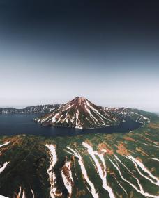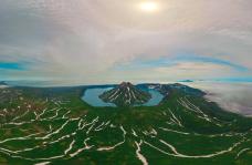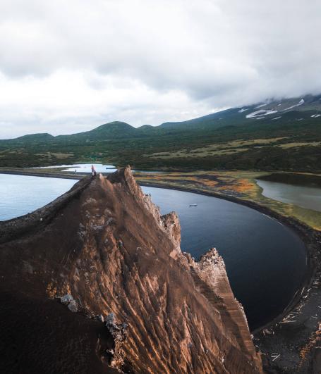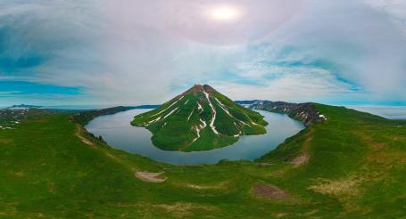 Пейзаж поражает своей масштабностью: внутри гигантской кальдеры древнего вулкана Тао-Русыр раскинулось Кольцевое озеро — а прямо в его центре поднимается идеальный конус вулкана.