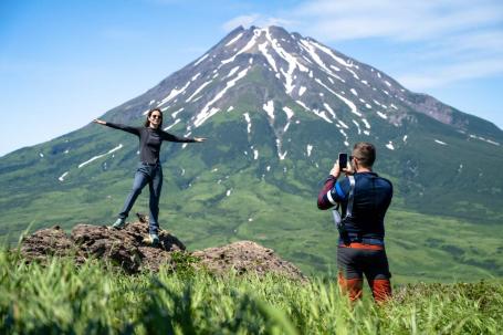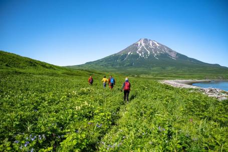 Вы сойдете на берег в бухте Крашенинникова и окажетесь в окружении вулканических вершин: вам откроется величественный Фусса высотой более 1,7 км, а также Карпинского, Ломоносова, Татаринова и Чикурачки. Затем вас ждет трекинг вглубь острова — чтобы насладиться панорамой вулканов с лучших обзорных площадок.