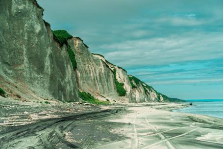Перед вами откроется пейзаж ярких контрастов: у подножия Белых скал лежит темно-серый вулканический песок, а сверху их украшает изумрудная растительность.