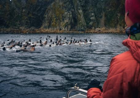 На обед вы остановитесь около Матыкиля — крупнейшего острова архипелага, высотой в 700 м. Здесь обитает большая репродуктивная колония сивучей: по последним данным, более 3 тысяч особей. Вы сможете понаблюдать за морскими львами и сделать фотографии. Неповоротливые и грузные на суше, самцы сивучей становятся ловкими пловцами в море и могут близко подплывать к катеру. Также Ямские острова известны огромным количеством морских птиц: насчитывают от 11 до 17 млн особей.