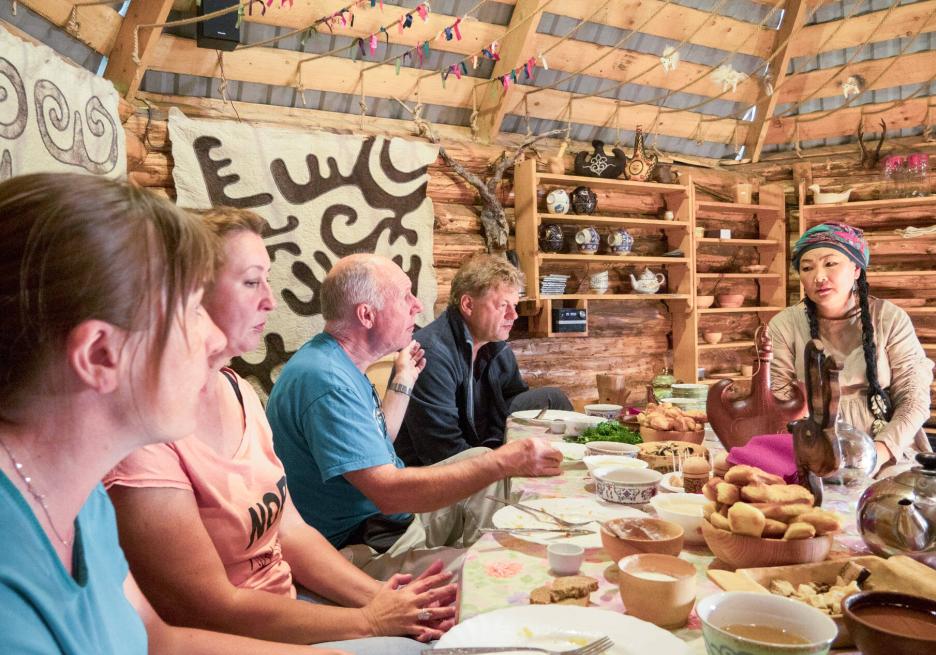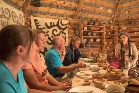 Программа включает элементы иммерсивности. Вы сможете принять участие в свадебном обряде, попробуете себя в игре на национальных инструментах, научитесь готовить алтайский десерт чок-чок. И конечно, отведаете национальные угощения.