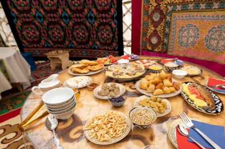 Попробуете хиты национальной кухни: ароматные румяные баурсаки и наваристый бешбармак с крупными кусками мяса и нежным тестом