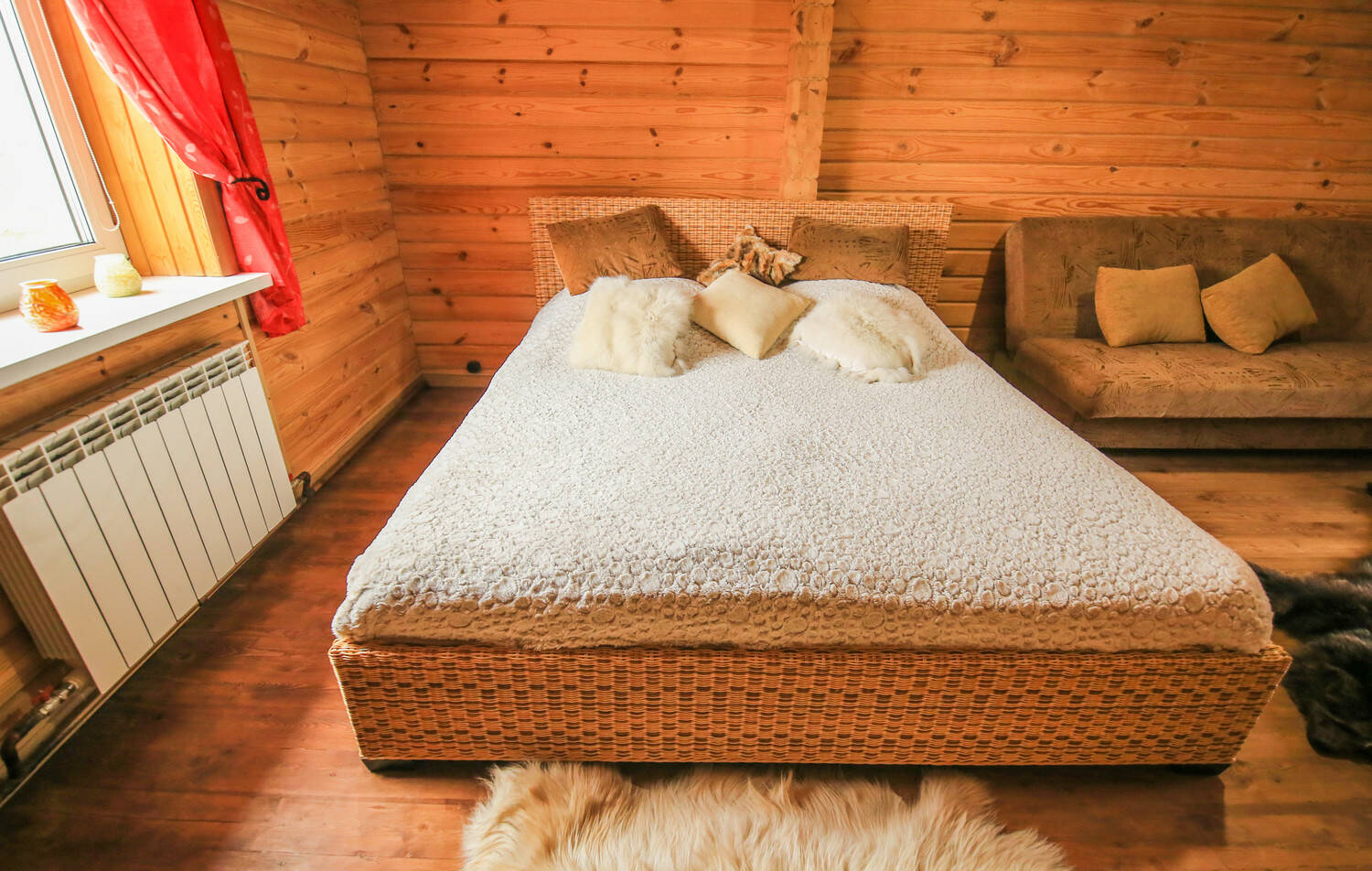 Спальни расположены на втором этаже. В одной — двуспальная кровать, раскладной диван. К спальне примыкает лоджия с двумя 1,5-спальными кроватями и панорамными окнами. Этот вариант подойдет для семьи или группы друзей.